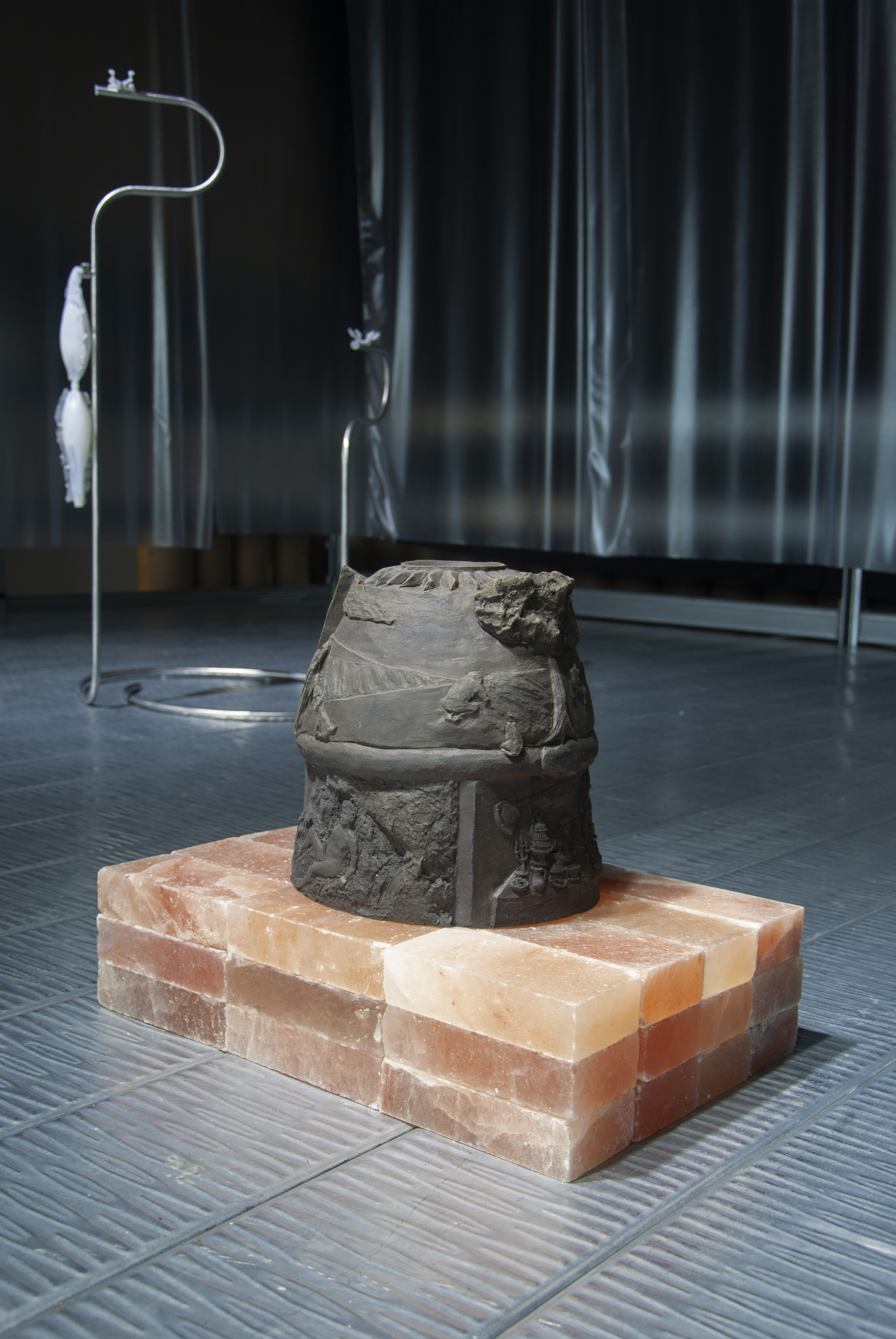 Bricks of Himalayan salt, hanging walls made of semi-transparent foil.